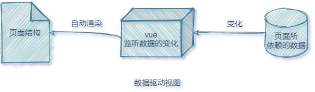 在使用了 vue 的页面中,vue 会监听数据的变化,从而自动重新渲染页面的结构。示意图如下: