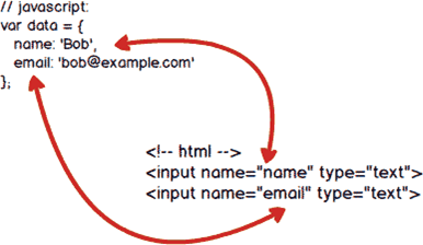 在填写表单时,双向数据绑定可以辅助开发者在不操作 DOM 的前提下,自动把用户填写的内容同步到数据源中。示意图如下: