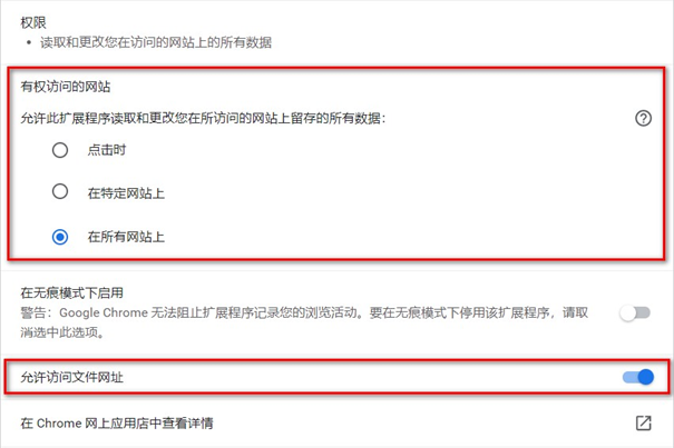 点击 Chrome 浏览器右上角的 按钮,选择更多工具 -> 扩展程序 -> Vue.js devtools 详细信息,并勾选如下的两个选项: