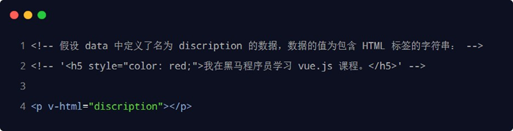 v-text 指令和插值表达式只能渲染纯文本内容。如果要把包含 HTML 标签的字符串渲染为页面的 HTML 元素,则需要用到 v-html 这个指令: