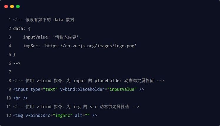 如果需要为元素的属性动态绑定属性值,则需要用到 v-bind 属性绑定指令。用法示例如下:
