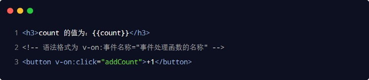 vue 提供了 v-on 事件绑定指令,用来辅助程序员为 DOM 元素绑定事件监听。语法格式如下: