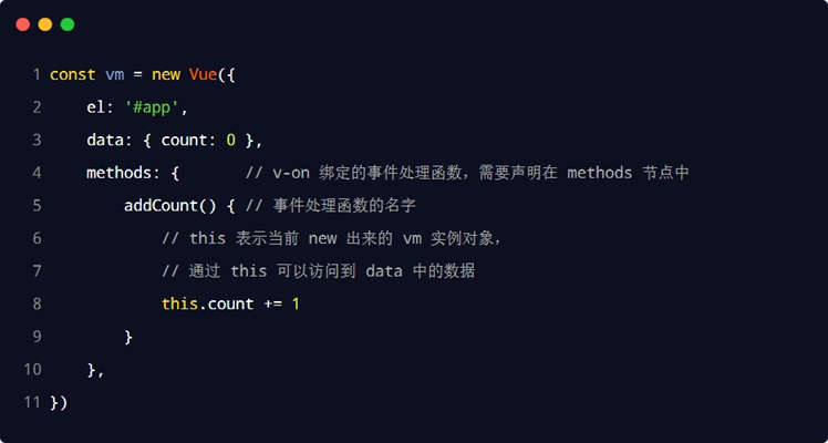 通过 v-on 绑定的事件处理函数,需要在 methods 节点中进行声明: