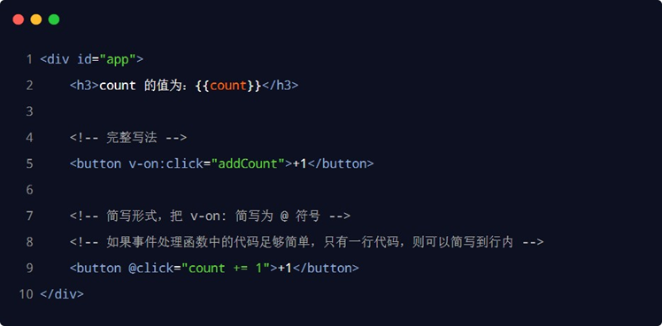 由于 v-on 指令在开发中使用频率非常高,因此,vue 官方为其提供了简写形式(简写为英文的 @ )。