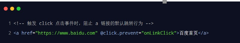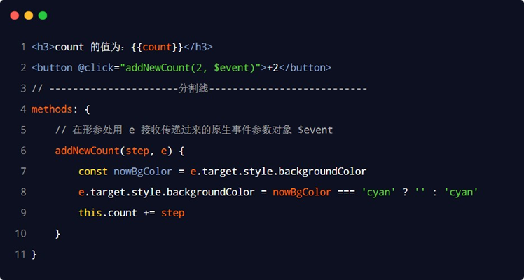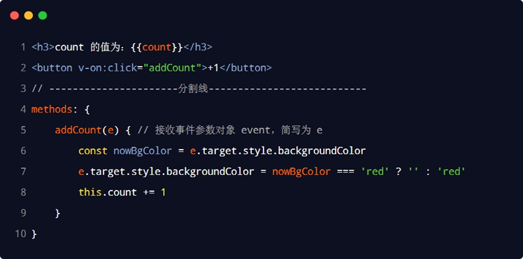 在原生的 DOM 事件绑定中,可以在事件处理函数的形参处,接收事件对象 event。同理,在 v-on 指令(简写为 @ )所绑定的事件处理函数中,同样可以接收到事件对象 event,示例代码如下: