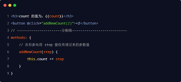 在使用 v-on 指令绑定事件时,可以使用 ( ) 进行传参,示例代码如下: