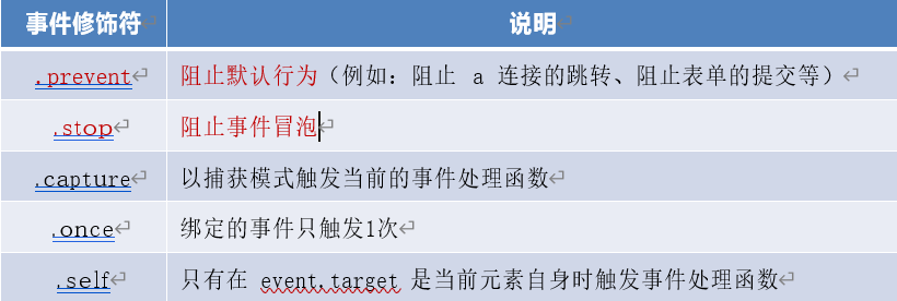 在事件处理函数中调用 preventDefault() 或 stopPropagation() 是非常常见的需求。因此,vue 提供了事件修饰符的概念,来辅助程序员更方便的对事件的触发进行控制。常用的 5 个事件修饰符如下: