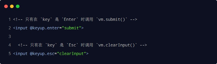 在监听键盘事件时,我们经常需要判断详细的按键。此时,可以为键盘相关的事件添加按键修饰符,例如: