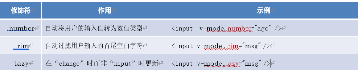 为了方便对用户输入的内容进行处理,vue 为 v-model 指令提供了 3 个修饰符,分别是: