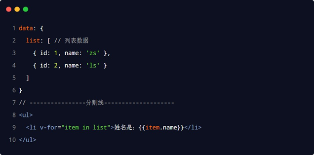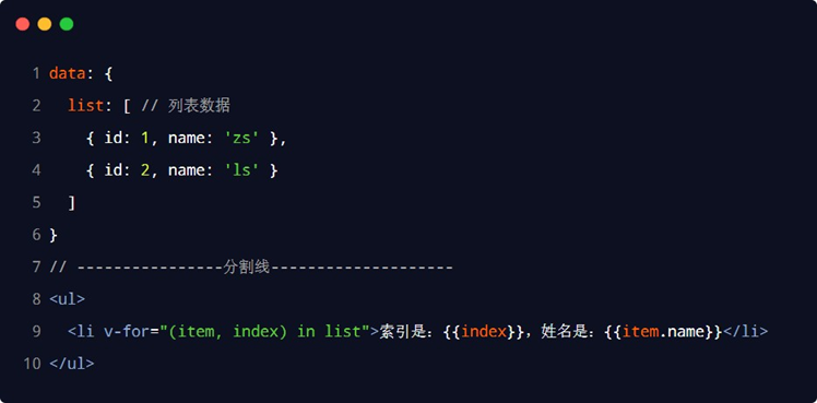 注意: v-for 指令中的 item 项和 index 索引都是形参,可以根据需要进行重命名。例如 (user, i) in userlist