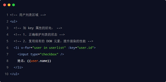 - 建议使用 v-for 指令时一定要指定 key 的值(既提升性能、又防止列表状态紊乱)